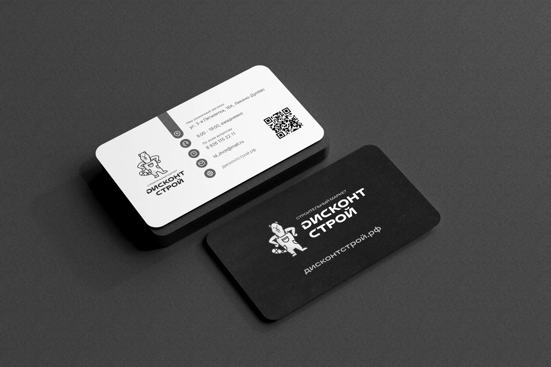 Вместе с логотипом, мы предложили заказчику сразу визуализацию логотипа в возможном дизайне на фирменный визитках магазина «Дисконт Строй» в Белово.
